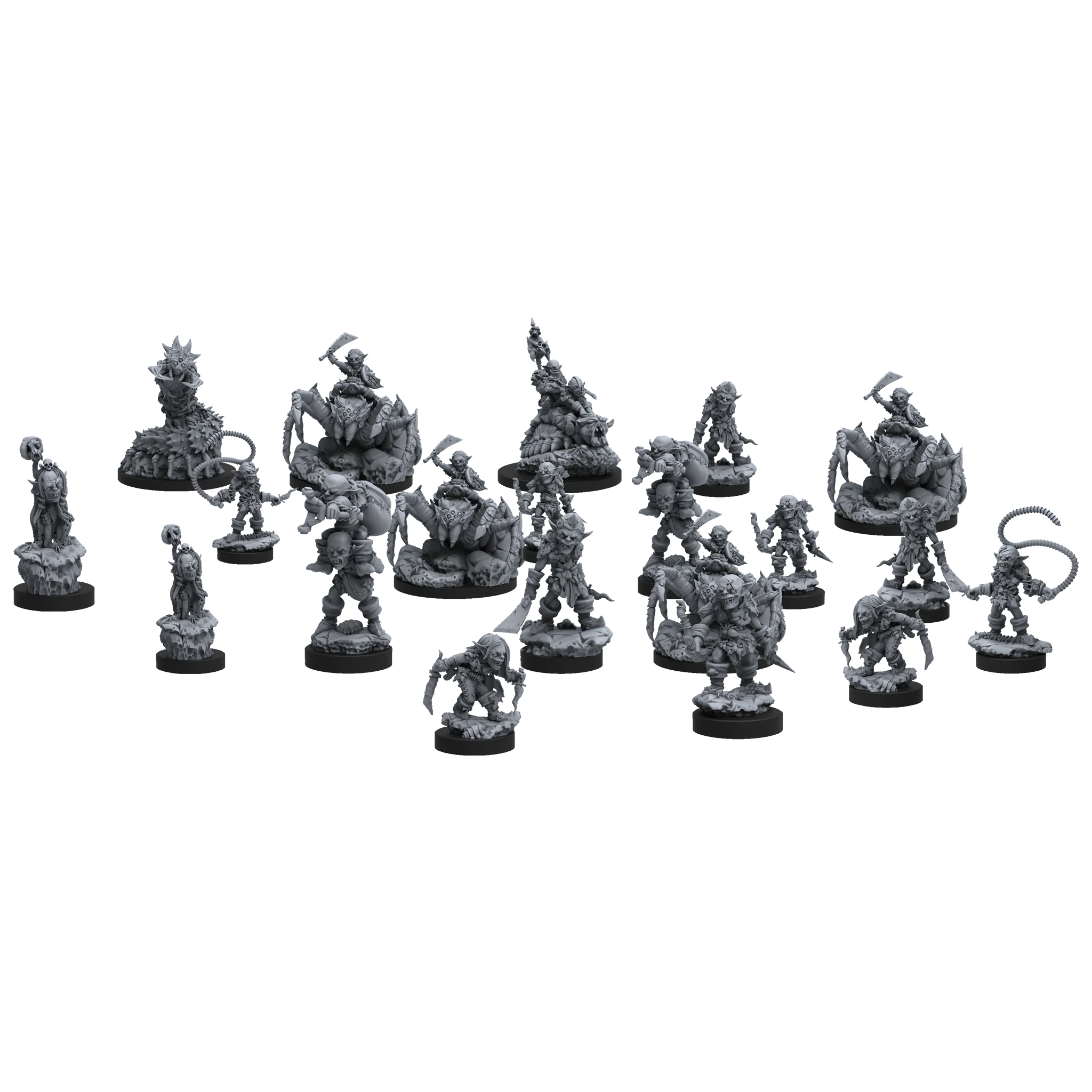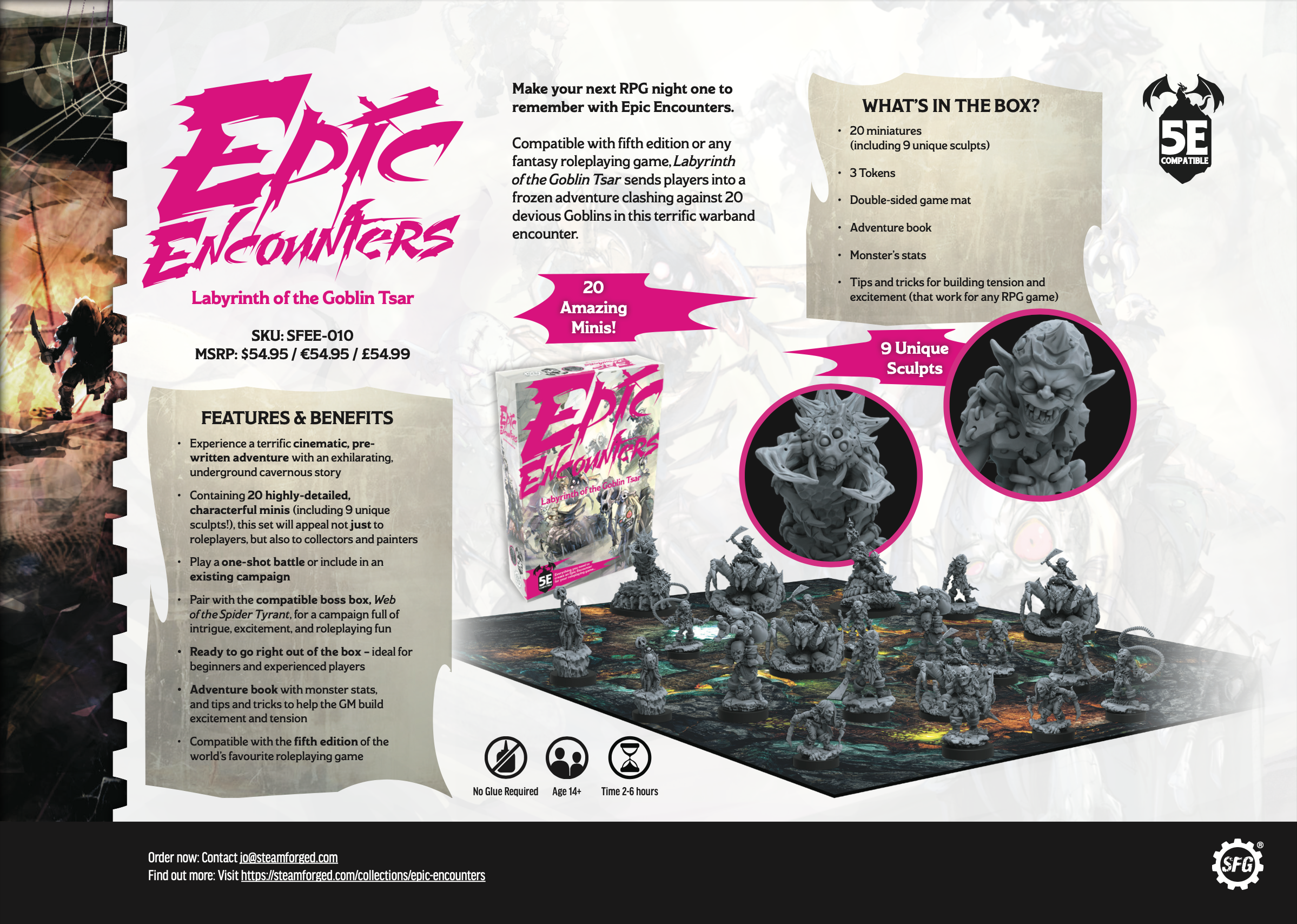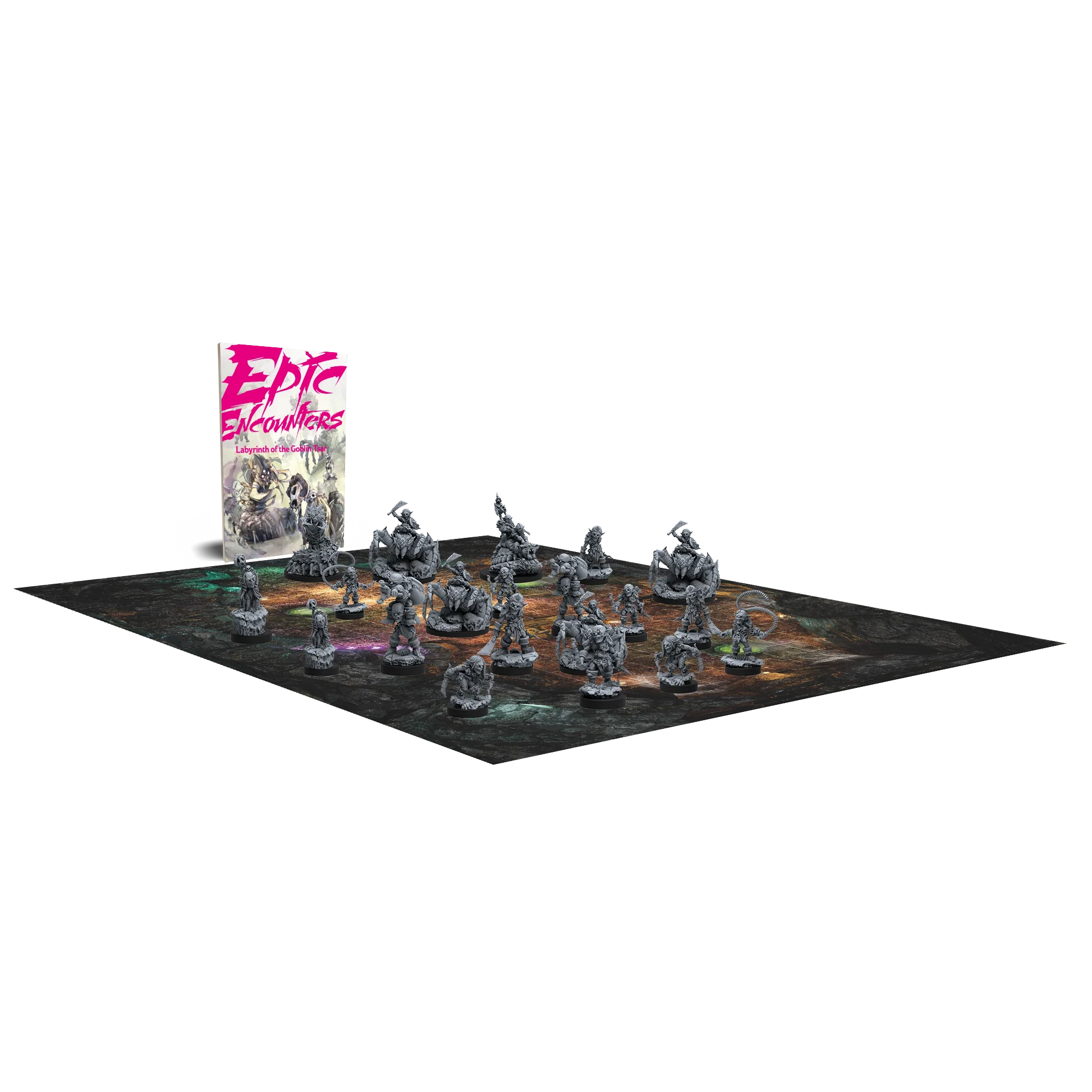• Playing Time: 120-360 • Age: 11+ Descend into the black depths of the Goblin Tsar’s labyrinth in your next roleplaying campaign with this Epic Encounters warband box! Compatible with fifth edition or any fantasy roleplaying game. Down in the labyrinth, the chittering shadows seem alive. Hungry. Perhaps it’s not the Tsar you should fear, but the one he serves. The one who consumes disobedient goblins and lost travellers alike. The one they call the many-legged prince... Inside this warband box, you’ll find everything you need to unravel the evil of the Tsar, including 20 highly detailed minis and an adventure book woven with information to fuel your imagination. Can you brave the depths and end the terror? Use Labyrinth of the Goblin Tsar as a standalone encounter or as part of a new or existing game!