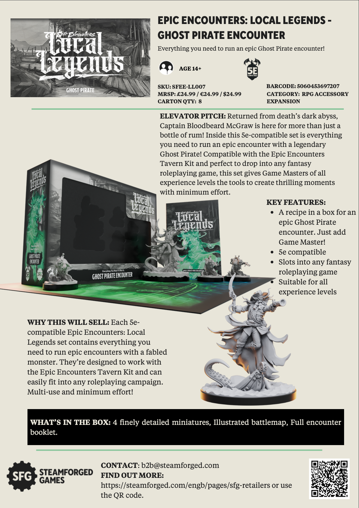 • Playing Time: 120-360 • Age: 14+ Returned from death’s dark abyss, Captain Bloodbeard McGraw is here for more than just a bottle of rum! Calling all Game Masters! Inside this box is everything you need to run epic roleplaying encounters with a bloodthirsty Ghost Pirate, with minimal effort. Legend has it the pirate captain is back from the dead to recruit new members for his otherworldly crew. Will your party step in… or will you be next? Designed to work with the Local Legends Tavern Kit but easily adaptable for any campaign, the Hill Giant encounter kit is 5e-compatible and can be used with any fantasy roleplaying game. Just add GM! What's in the box? - 4 detailed minis - Illustrated battlemap - Complete encounter booklet