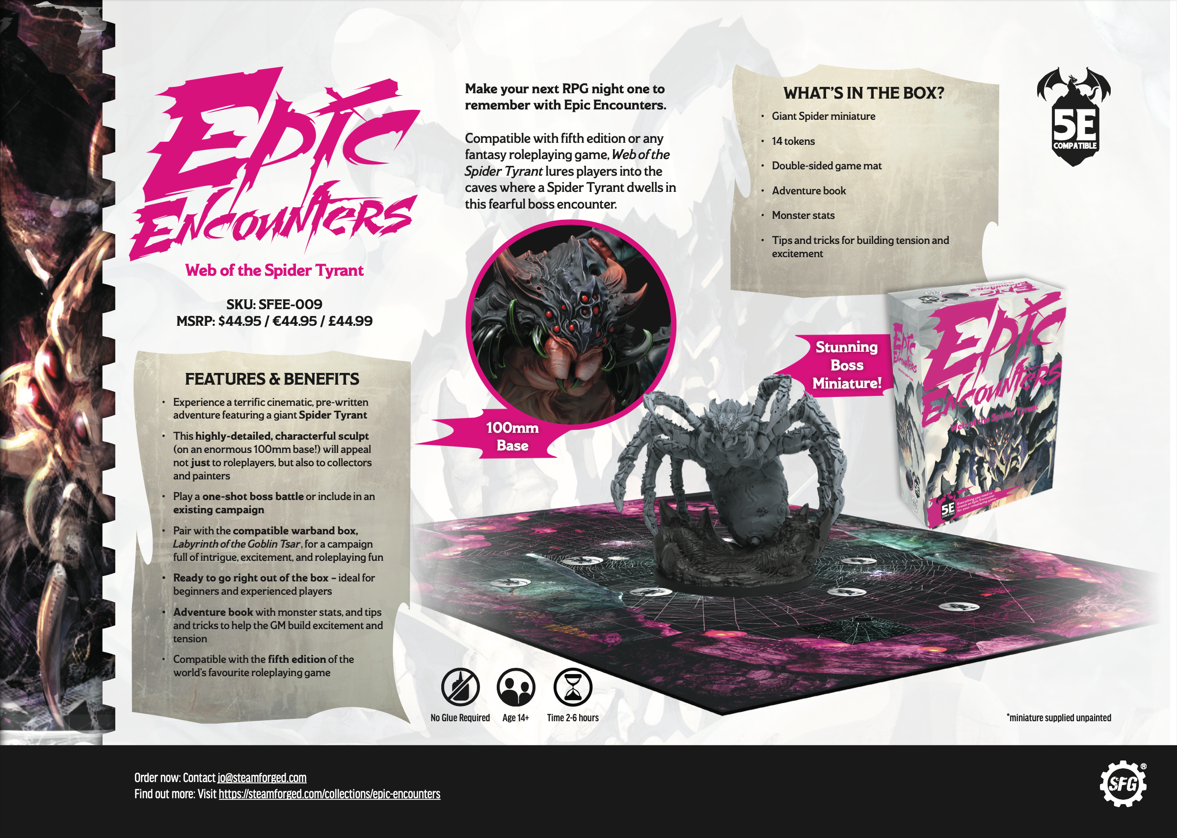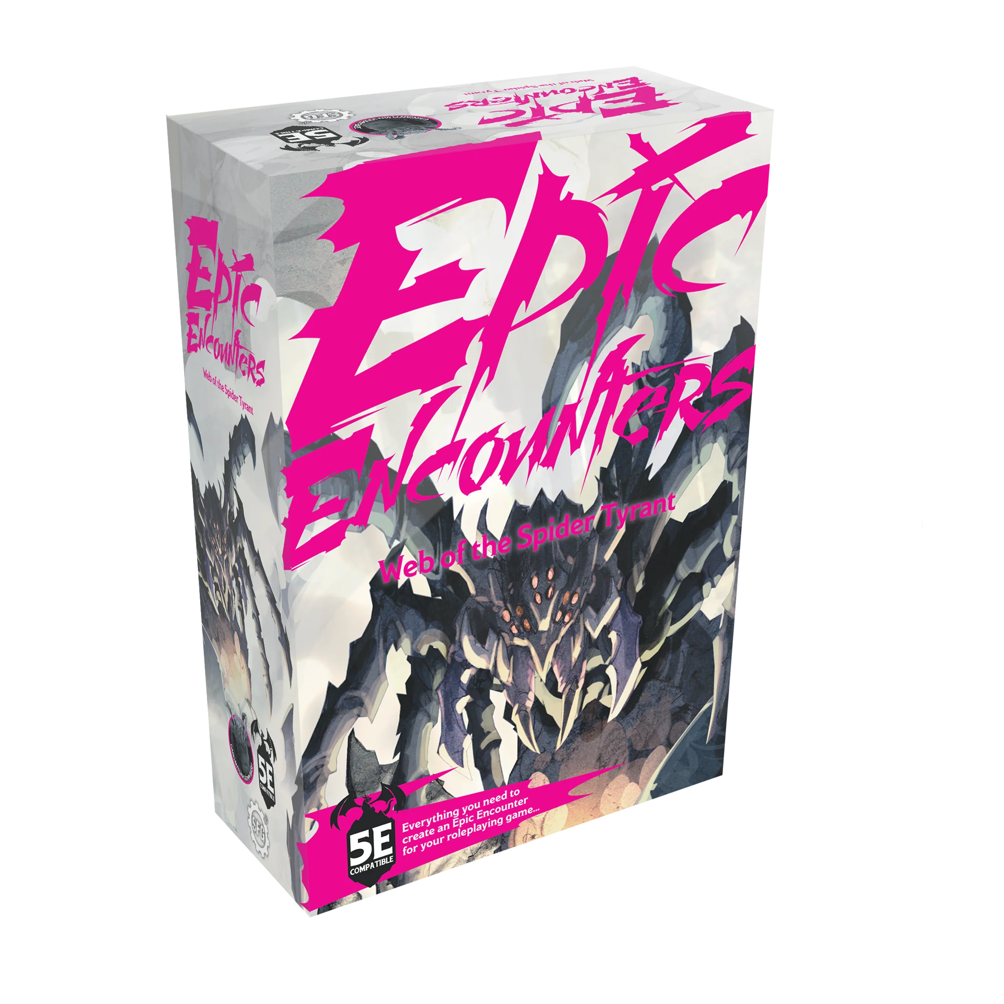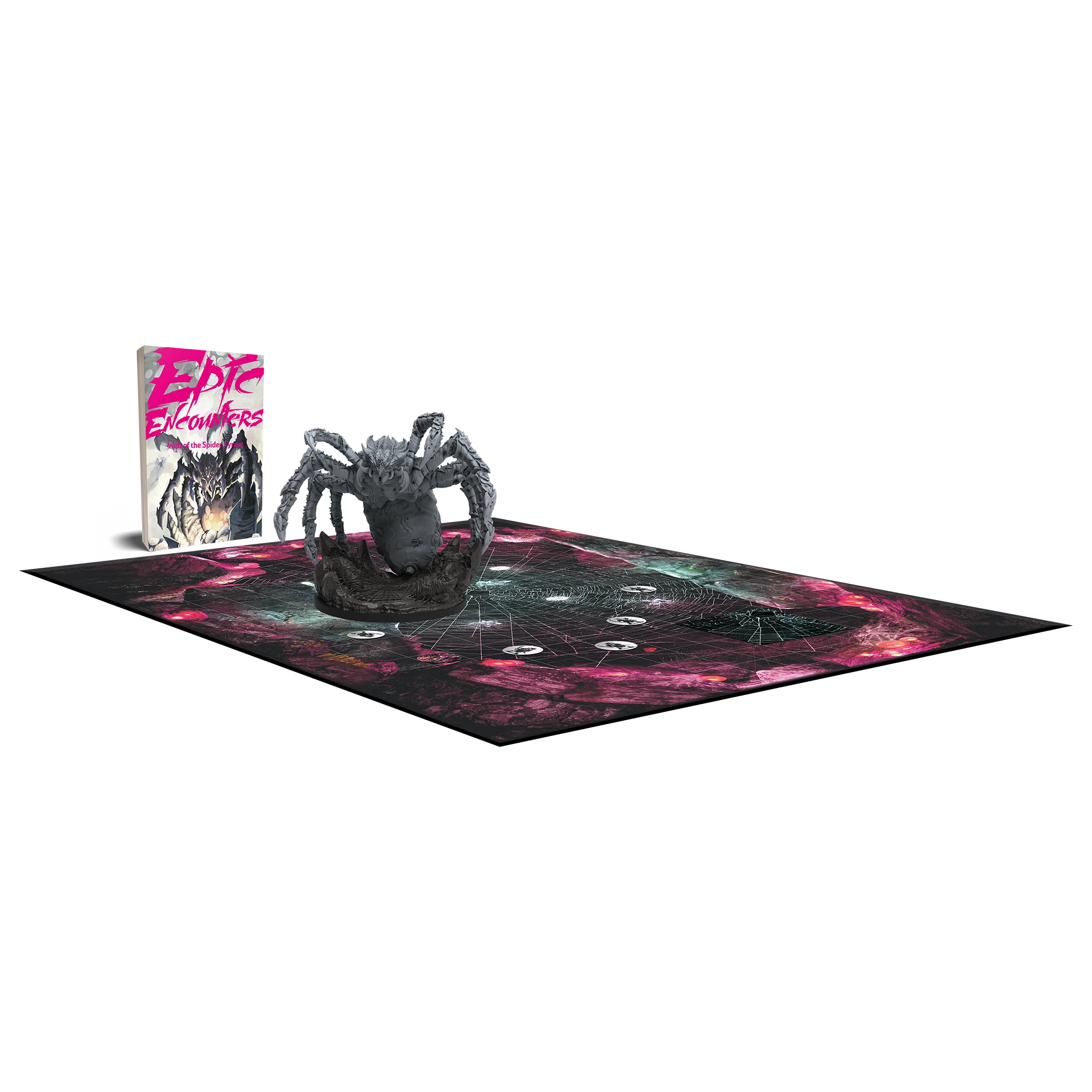• Playing Time: 120-360 • Age: 11+ Ensnare your roleplaying group in a sticky situation with Web of the Spider Tyrant, containing all the ingredients you need to run a skin-crawling Giant Spider encounter! (Including a SCARILY detailed Giant Spider miniature on a 100mm base.) Compatible with 5e or any fantasy roleplaying game, Web of the Spider Tyrant is an Epic Encounters boss box that takes you deep into the spider’s web. There in the dark depths lurks the Spider Tyrant — an ancient fear, old as time and twice as deadly. Few who encounter one survive, and those who do are forever changed. Can you escape the eight-legged clutches of the ultimate fear? What's in the box? - 1 unpainted Giant Spider Miniature (100mm base) - Tokens - Double-Sided Game Mat - Adventure Book (with monster stats)