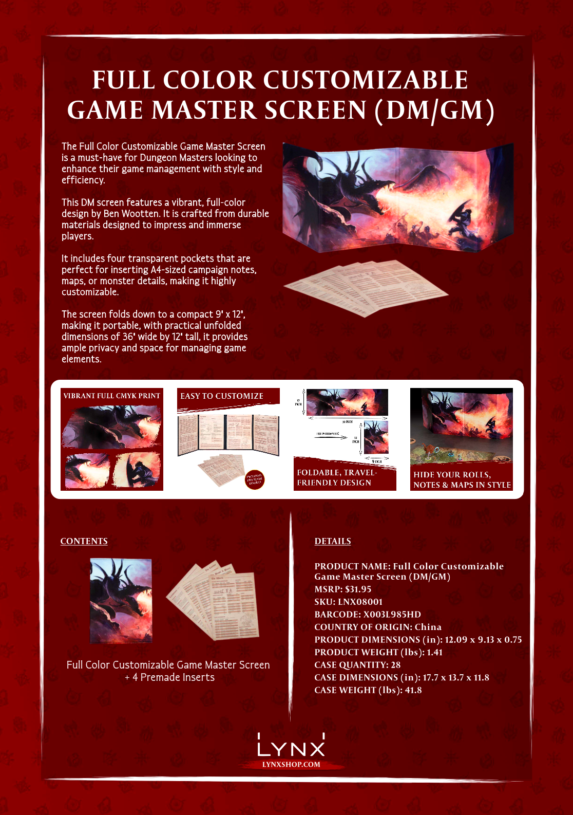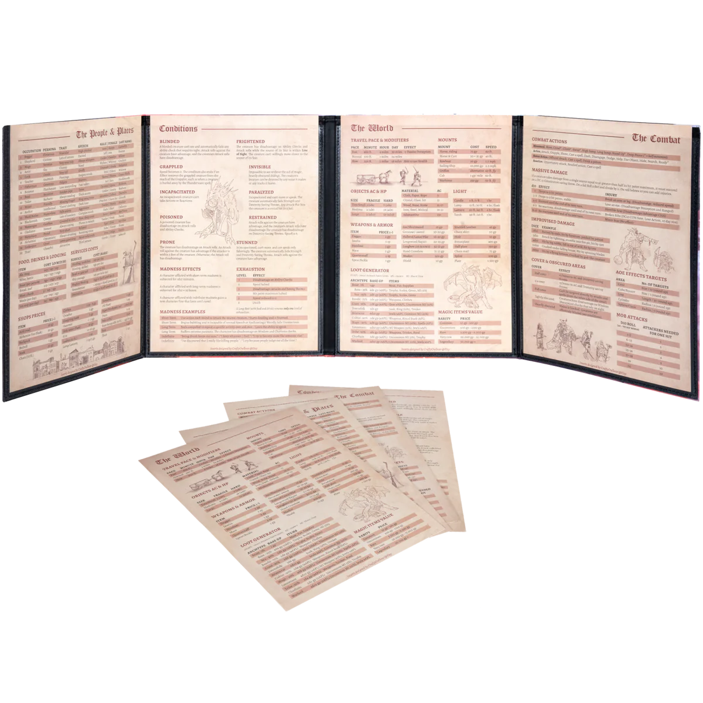 Elevate your DM game with our stylish and durable full color DM Screen and keep your rolls, notes, and maps hidden. Portable and convenient, and folds down to a travel-friendly size. Features: Stylish & Durable: Boasts a vibrant full-color design, crafted from long-lasting materials to impress and immerse players. Customizable Storage: Includes four transparent pockets with premade inserts, adaptable for your A4-sized campaign notes, maps, or monster details. Portable Convenience: Folds to a compact 9" x 12" size for easy transport and storage, perfect for taking to gaming sessions. Ideal Gift for Dungeon Masters: A thoughtful and practical gift for your DM, enhancing their game management in style. Practical Dimensions: Unfolds to 36" wide by 12" tall, with a travel-friendly folded size of 9" by 12".